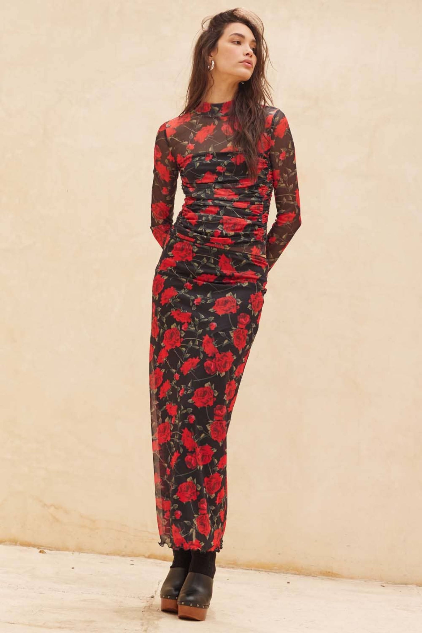 Romantic, bold, and effortlessly chic - our Rose Print Maxi Skirt is pure fashion poetry. Designed in a soft, semi-sheer mesh with an all-over red rose print, this relaxed fit skirt hugs your curves in all the right places while offering an elegant, flowy silhouette. The midi-to-maxi length and delicate lettuce hemline give it a flirty, feminine edge that transitions perfectly from day to night.