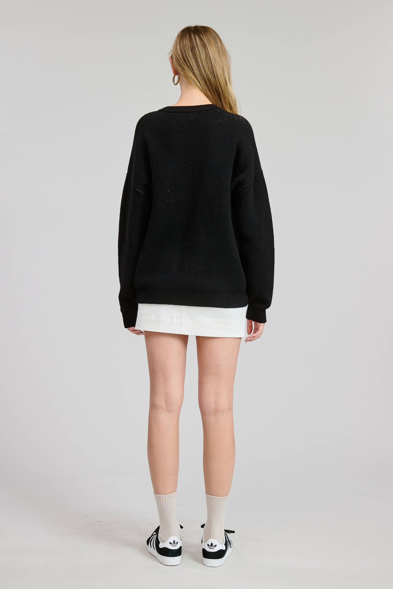 • Load image into Gallery viewer, Person wearing a black sweater and white skirt on a plain background