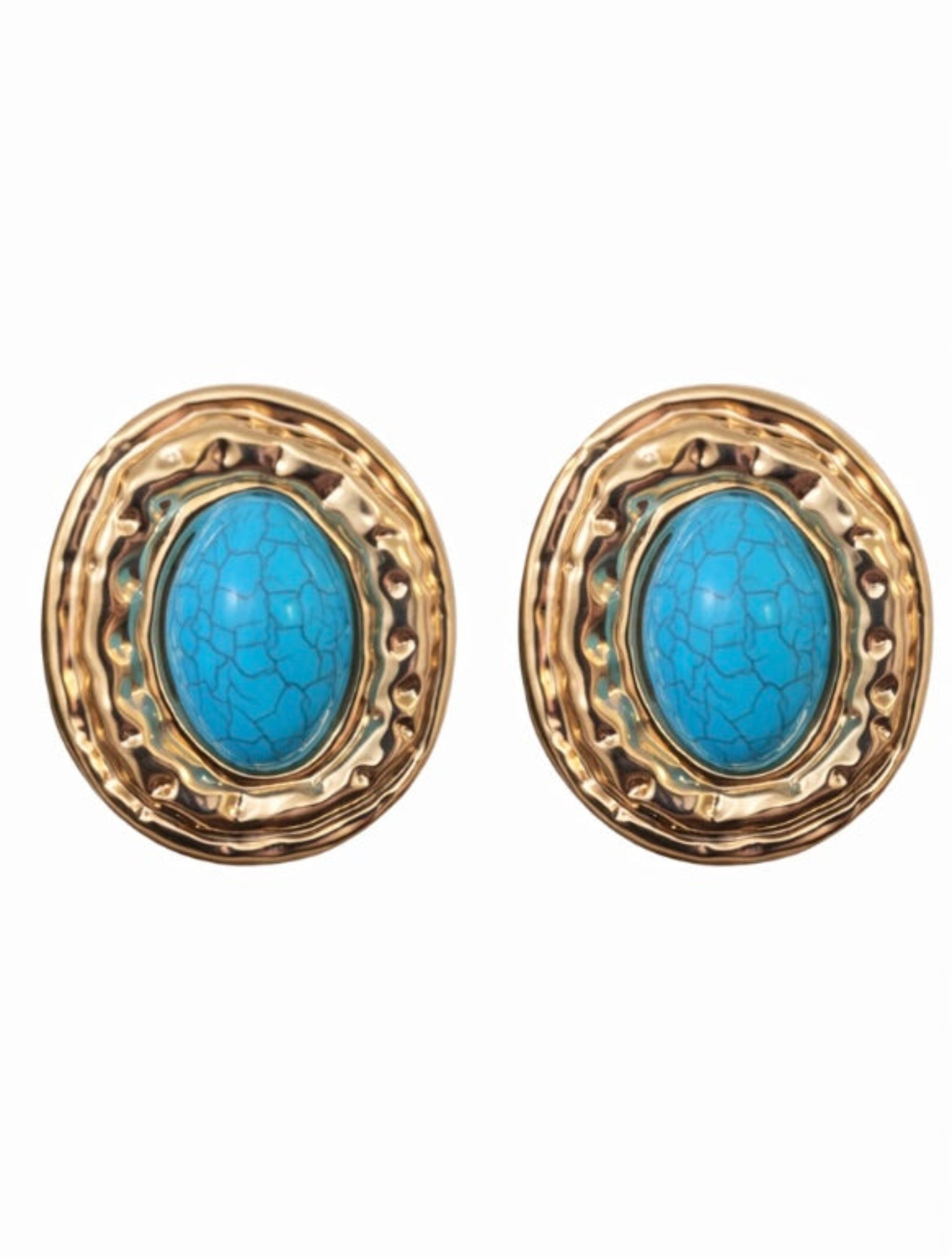 Make an entrance without saying a word. Our Turquoise Muse Statement Stud Earrings feature a striking oval turquoise stone with natural marbling, set in a textured, hammered gold-tone frame for a bold yet refined finish.