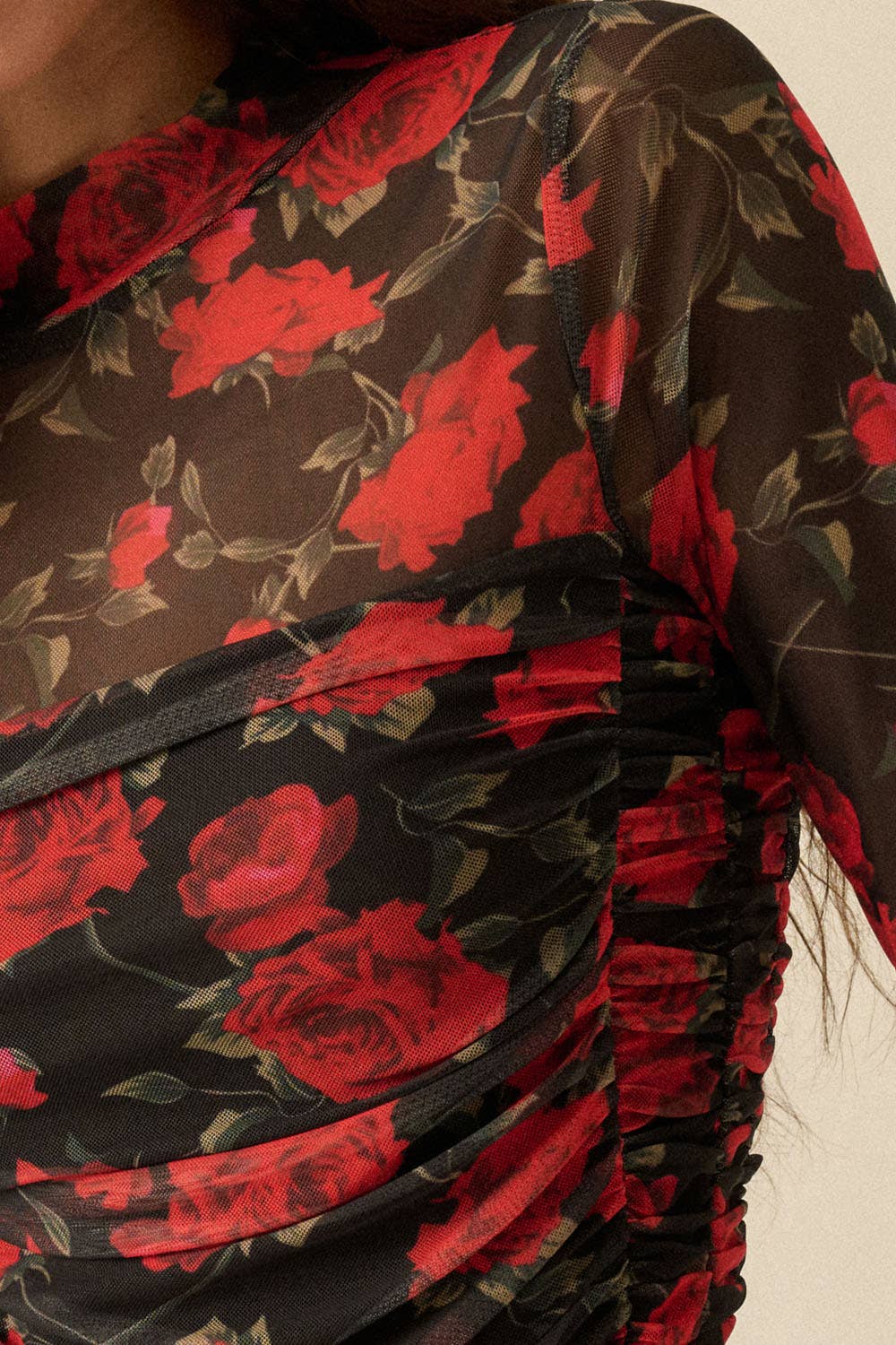 Floral Mesh Ruched Mock-Neck Bodysuit