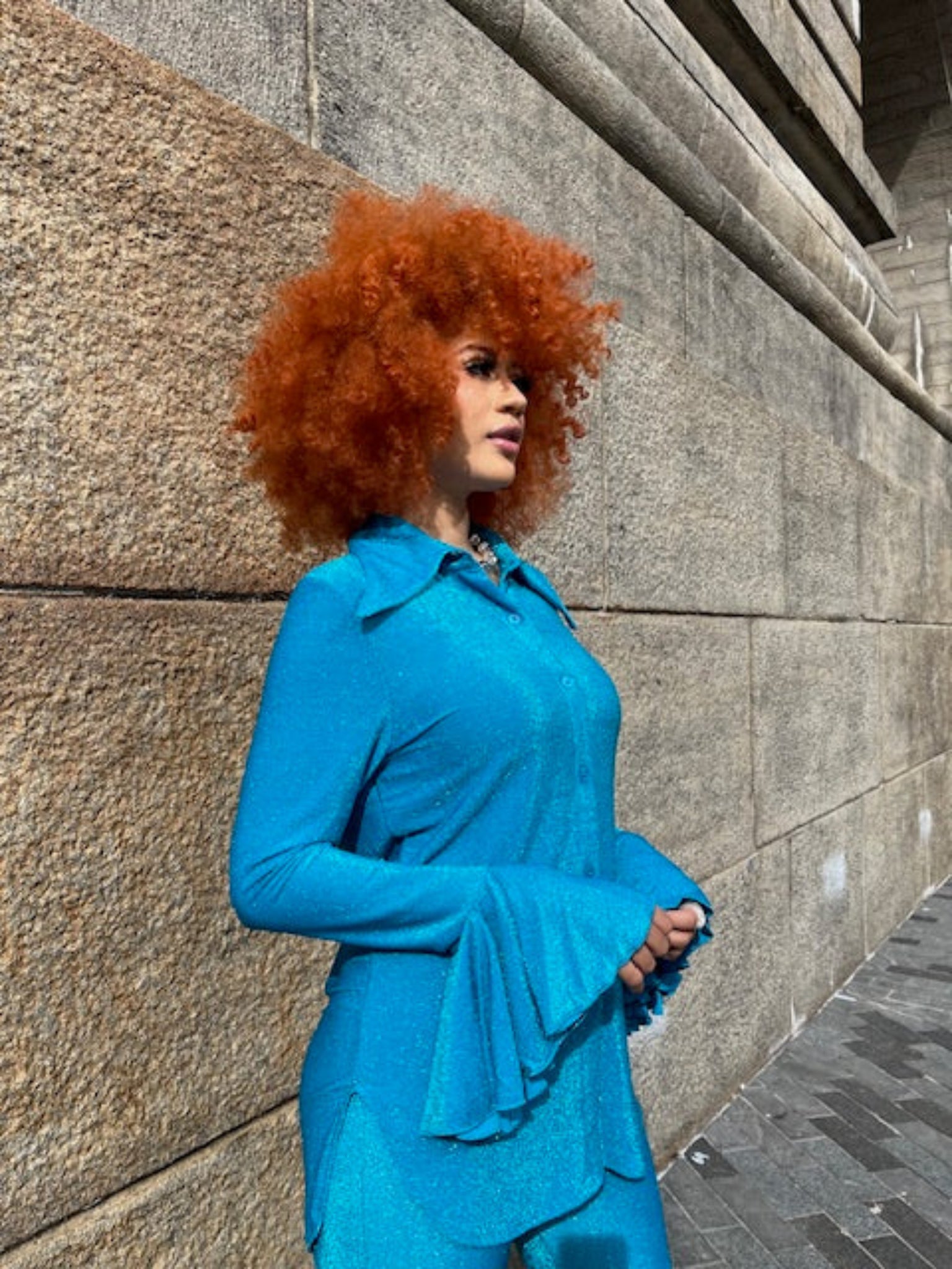 Turn heads in this bold and beautiful aqua set that channels pure retro-chic glamour. The tailored button-up shirt features dramatic flared sleeves for a touch of playful drama, while the matching high-waisted pants hug in all the right places before flaring out into a sleek, leg-lengthening silhouette. Made from a soft, stretch fabric with a subtle shimmer, this set is equal parts comfortable and statement-making.
